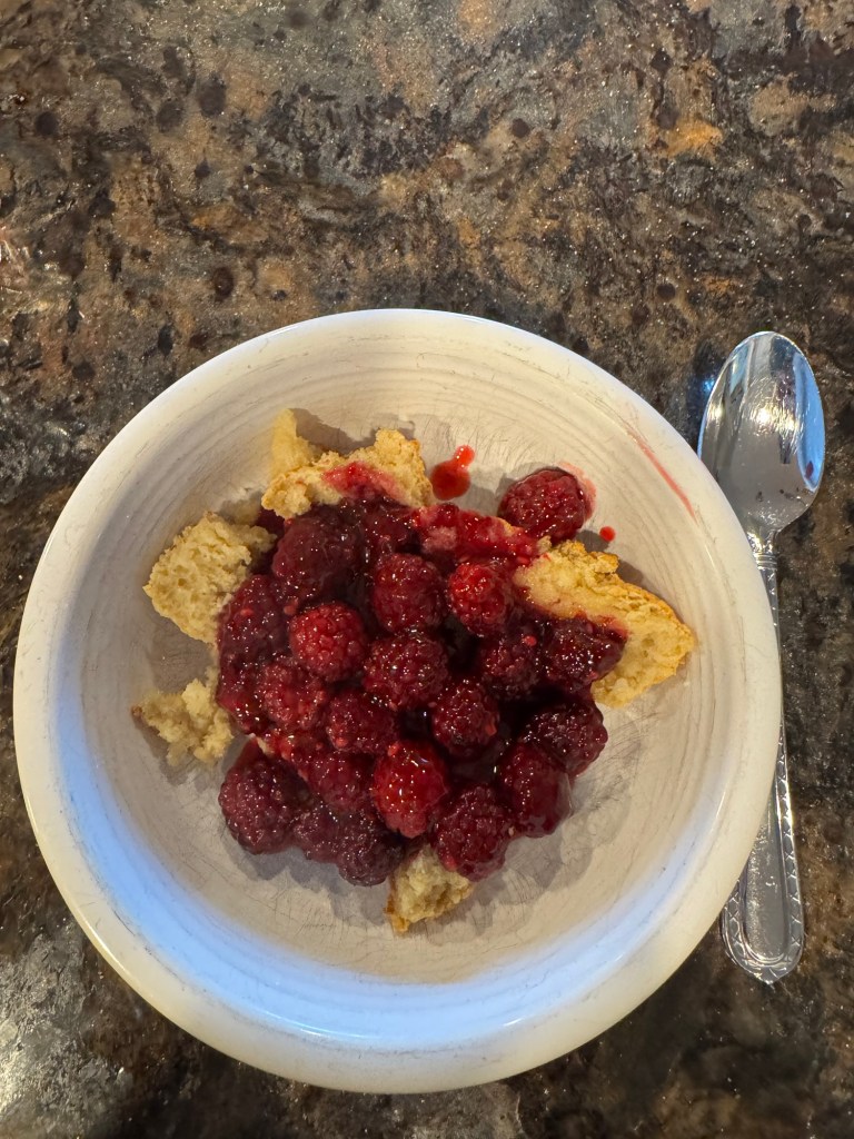 But this morning I had an idea. A family favorite is stewed blackberries over hot-buttered biscuits and Publix has the blackberries on BOGO this week. I was excited, until my biscuits failed. They didn’t rise as they should have—edible, but not fluffy.