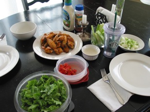 Dinner: Homemade Red Hot Buffalo Wings served with Ice Cold Salads with tomato and cucumber from our garden!