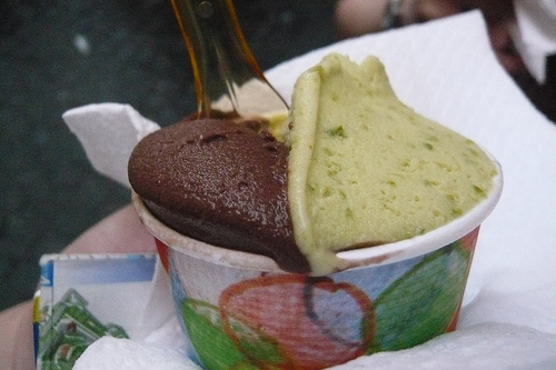 After awhile, we headed back downstairs to this cute Italian shop that we spotted on the way in. We chose a chocolate pistachio gelato and shared it on the piazza while a woman sang Italian opera on the terrace above.