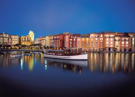 When our babysitter arrived, we headed out to a local resort hotel called the Portofino Bay Hotel at Universal Studios. The entire resort is dedicated to replicating Italian architecture and atmosphere. There are large piazzas, a lagoon with boats anchored in the water, restaurants, shops and nightly entertainment all focused on representing some aspect of Italian life.