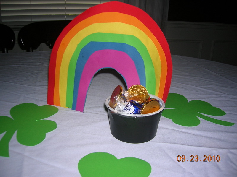 To introduce the travel theme for the evening I covered our dining table with a white tablecloth and scattered some large green paper shamrocks all around. In the middle of the table was a construction paper rainbow with a little “pot” attached to one end. The pot was filled with my husbands favorite candy…………dark chocolate………and a couple of chocolate gold coins that I purchased at a party store(see attached).