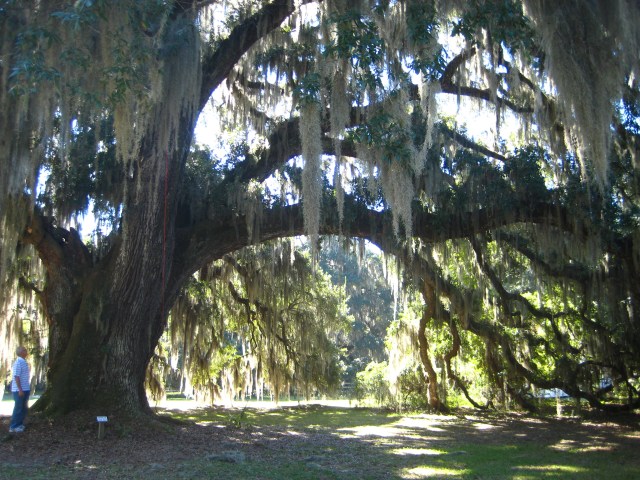 It was ironic that his frame matched that of the old oaks surrounding the house. He, too, was as tall as he was wide and had a scruffy white beard that mimicked the Spanish moss hanging from the tree limbs. He added to the history in his own way. As he stood to show us the 800 year old live oak on the side of the house, we took in it’s size and beauty.