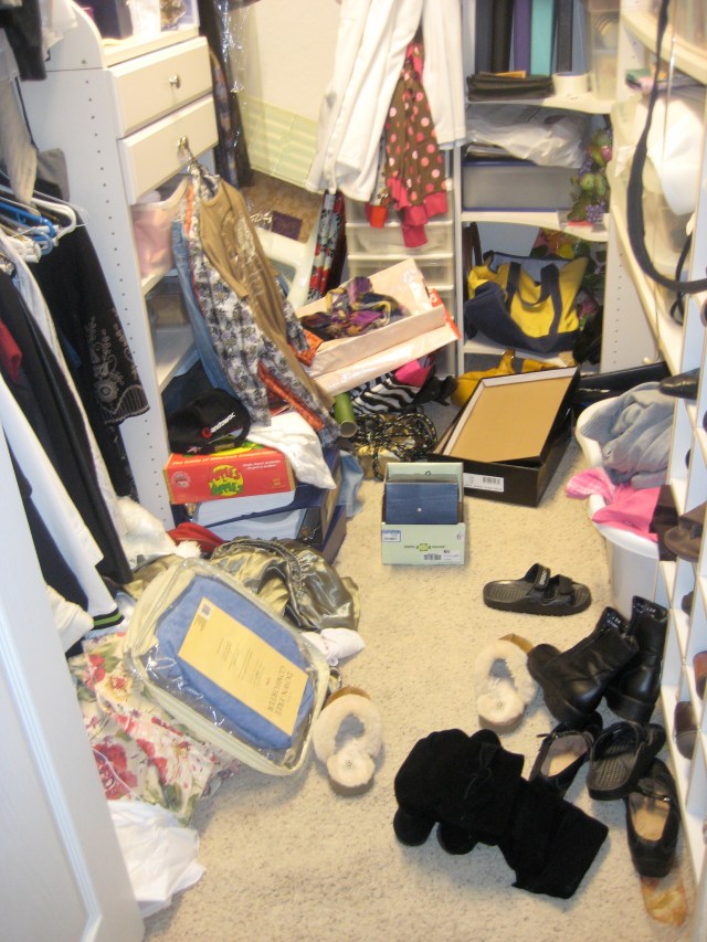 They make him nervous and unable to relax. The amazing thing is, I have had piles all over the house for a while now. Things I never seem to make the time to get to. I had no idea these we affecting him this way, so I took it upon my self to tackle one big pile today – my closet. If there is any doubt it needed cleaning – here’s the before picture: