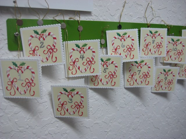 I decided to make a personalized advent calendar for him to open daily beginning tomorrow. I was supposed to pick him up at 9:30p. which would have given me plenty of time to finish it. However, he just called saying he booked an earlier flight and wants to take me to dinner at 7:30p. Yea for date night – uh-oh for getting his calendar ready. I may only be a day ahead of him now, but that’s okay. I have found that plans are often adjustedm and it’s important not to give up on your idea. Work around the unexpected – it’s so worth the effort!