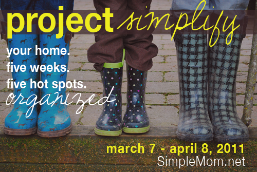 The Simple Mom, author of the book, Organized Simplicity, is challenging us to take the next five weeks to tackle five “Hot Spots” in our homes in need of serious decluttering, organizing and cleaning. She is calling it PROJECT SIMPLIFY. She wants us to take before and after pictures each week and share them with all the others taking part. On Friday she’ll open her blog for these pictures to be posted by sharing a link to your blog. One person will be chosen to win that week’s giveaway. Sounds fun doesn’t it? Okay, maybe fun is a stretch – but I know it will be rewarding. 🙂