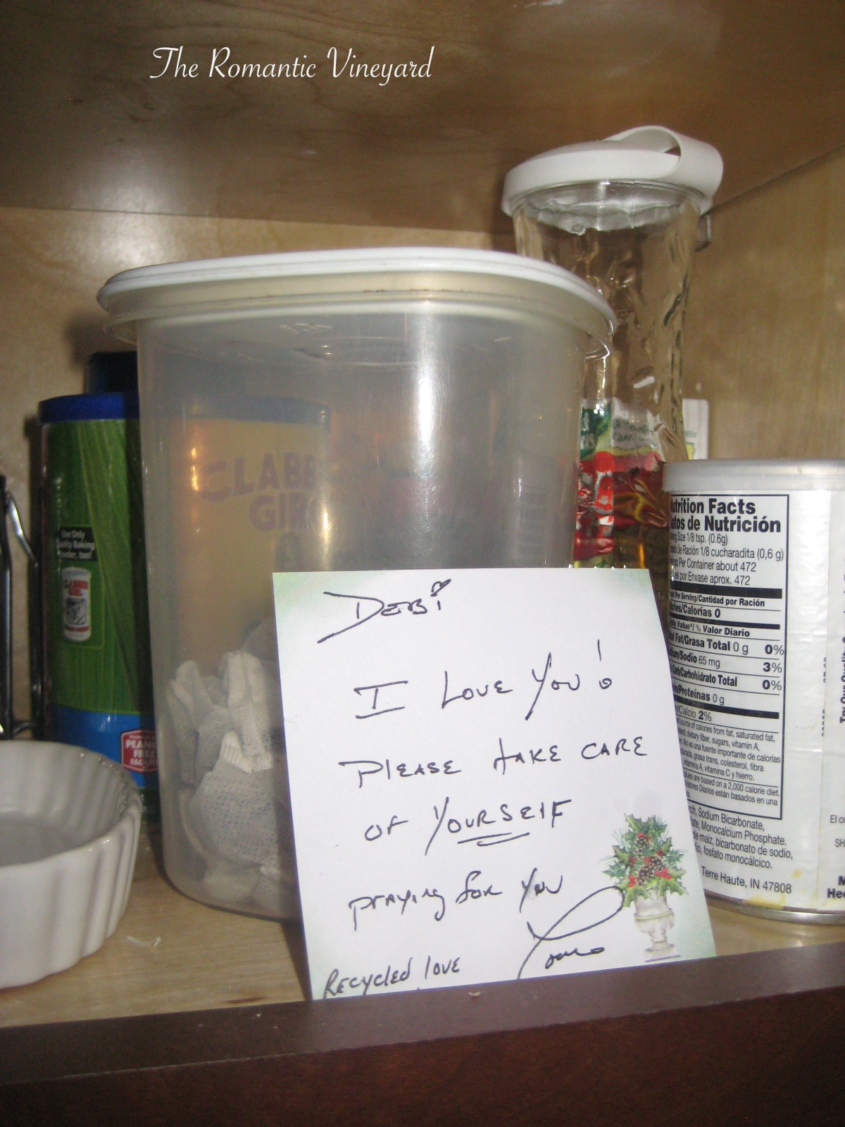 Notice at the bottom it says, “Recycled love note.” Yep, he placed the same note in the same place a couple of days later. 🙂 It was a small way he shared with me his care and love. My favorite part is how he always puts a ♥ for the dotted “i” in my name. He has done this since we dated 33 years ago.