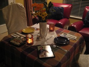 I had Debi leave for a little while so I could get things ready. When she returned, I led her to a table I had prepared in our bedroom for dinner. I sat her down to a lovely setting centered with a bouquet of daisies. There was a movie jacket and our first course (sushi) waiting. We sat and talked over our day while enjoying our appetizers.