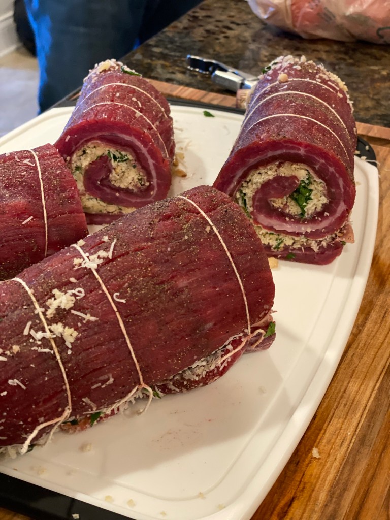 Her Mama is full-blooded Italian and every Christmas she makes Braciole, pronounced “bras-chee-ow-lay”—a flank steak pounded flat and layered with garlic, parsley and other herbs, garlic, pine nuts, Parmesan and Romano cheeses and more garlic. I added panko bread crumbs to help soak up the basil San Mariano tomato sauce. It did its job too. Once the layers are in place you roll it up roulade-style and secure with butchers twine. Sear them and place in the tomato sauce to cook in a slow oven for a couple of hours. Yum!