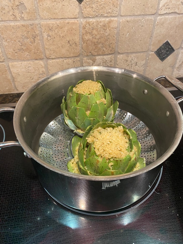 Place artichoke in a shallow bowl or pan. Using a small spoon, place stuffing inside each leaf. Continue until all leaves are filled with this yumminess. Finally, place stuffing on the top and pack it down to give a nice pretty crust on top.