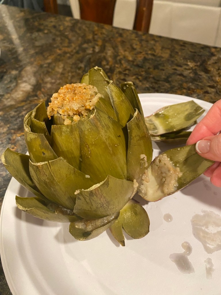 To eat, simply peel off a leaf and scrape the stuffing into your mouth. The artichoke has a bit of meat on the inside of each leaf. It is delicious.