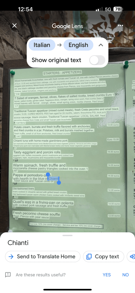 The menu was in Italian, so our Google Translate app became our personal guide.