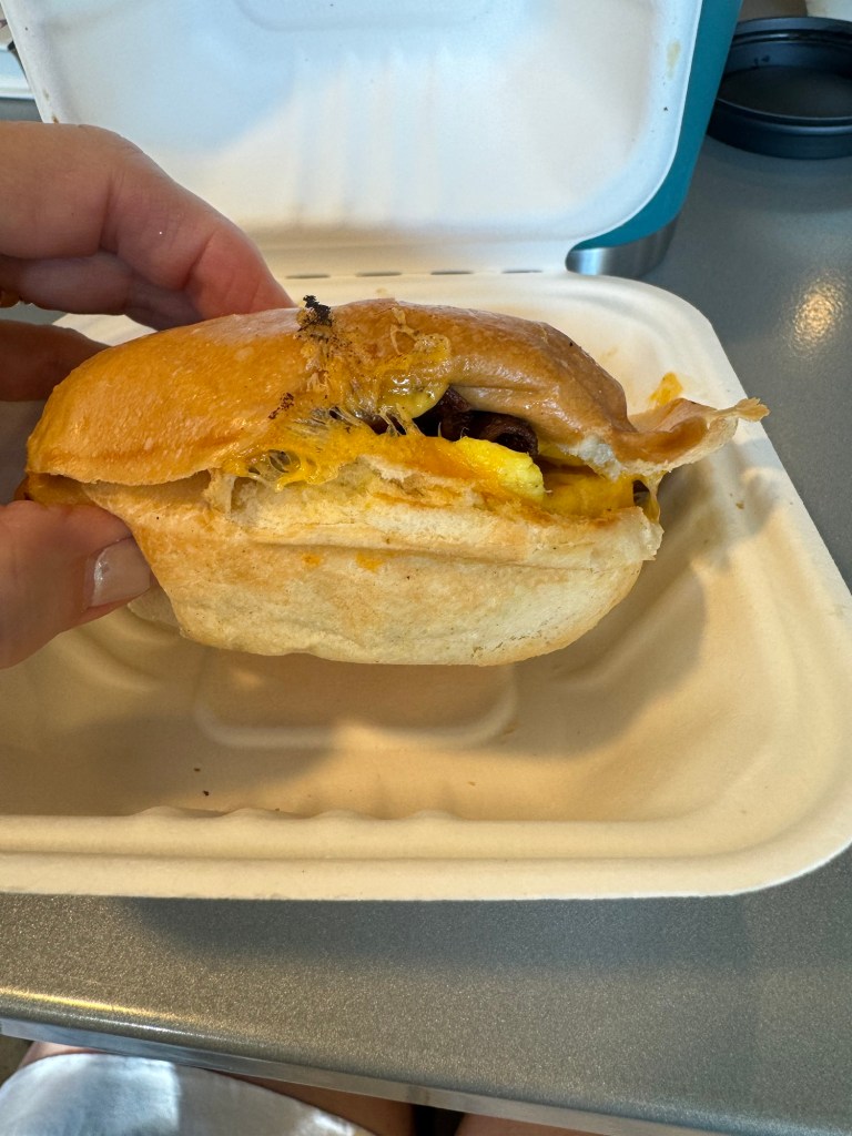 We had a delicious egg and cheese sandwich with bacon on a brioche bun, but catching up with our friends was sweetest part of the day.