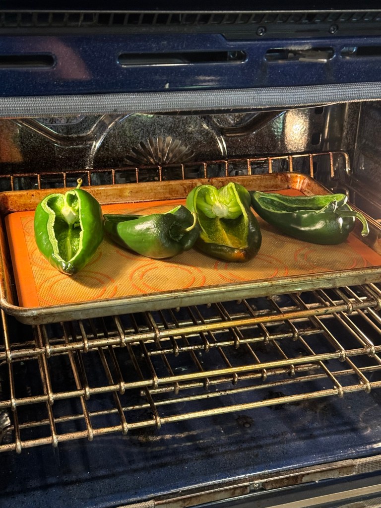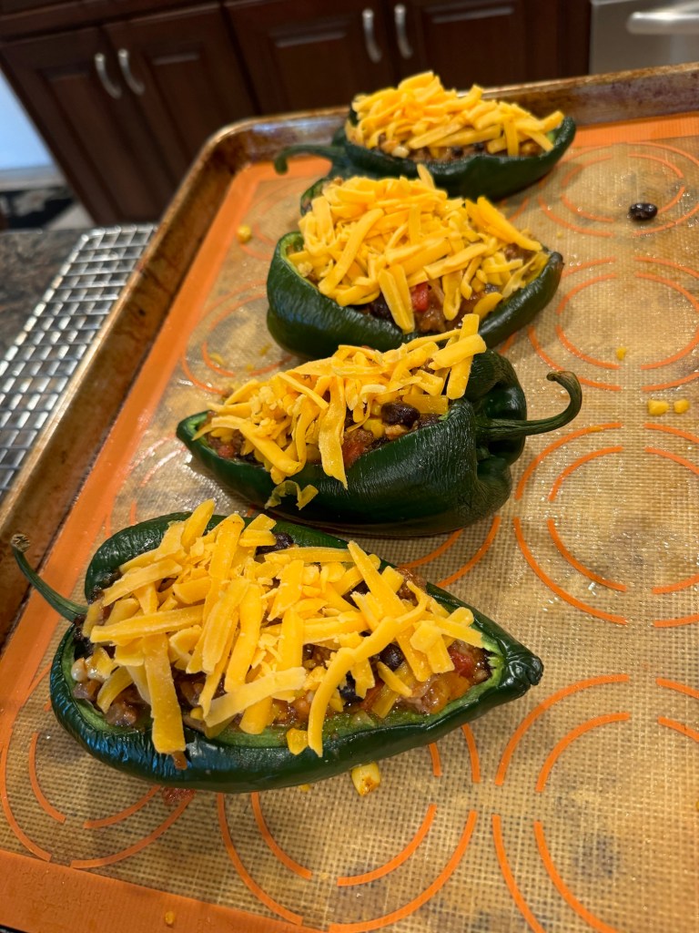 Stuffed Poblano Peppers were placed on the week’s menu remembering how good they were when we first made them years ago. We used the recipe from the Dinner at the Zoo website and it was even better than we remembered!