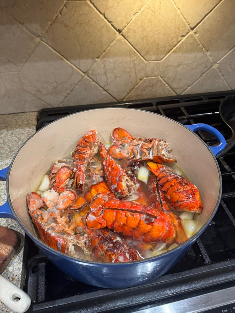 I discarded the veggies and lobster tails, then strained the stock. The house smelled delicious!
