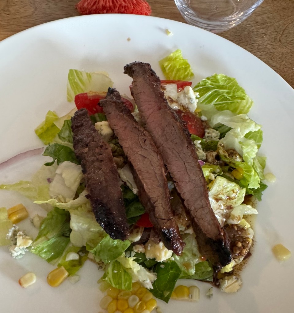 The meal was simple, but one of Tom’s favorites—grilled flank steak salad and fresh baked bread. We started with a shrimp appetizer too. But the highlight of the day was the bourbon cherry pie ala mode.