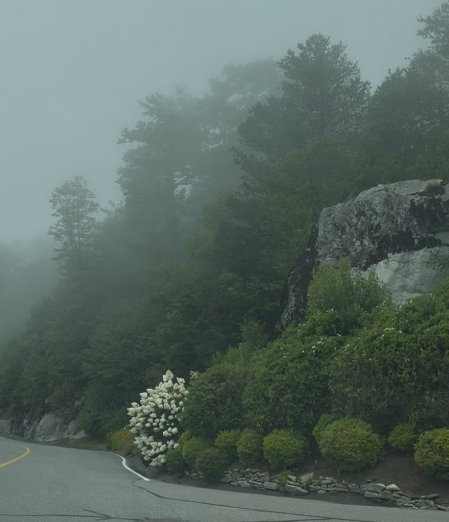 As we were driving out of the cloud to lower elevation I noticed how the clouds softened the hard scapes around me. Rough tree trunks looked soft like suede. Crinkled leaves looked like wispy feathers dancing in the breeze. The ground below looked like cushioned carpet. All the colors were muted with gray undertones. It was beautiful.