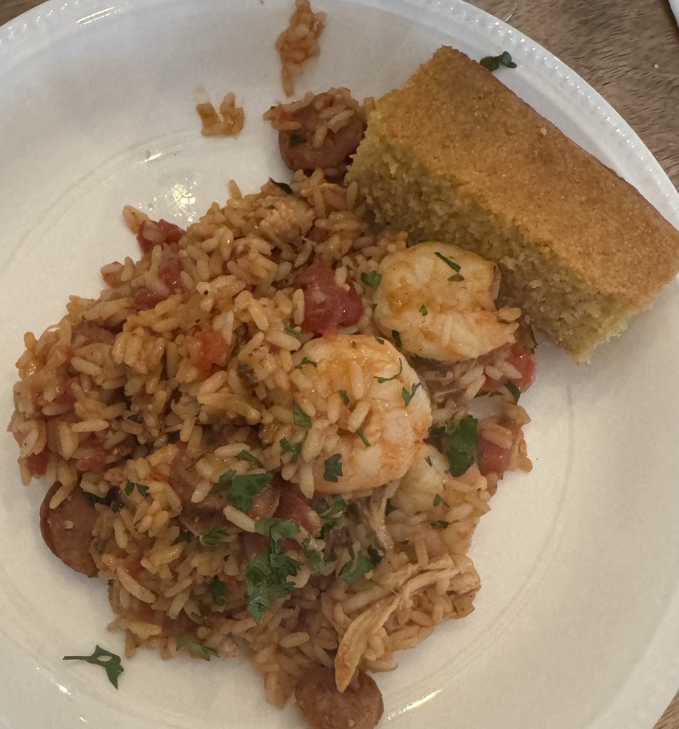 The menu was a delicious salad, (which they brought), Jambalaya with andouille sausage, chicken and shrimp and homemade cornbread on the side. This meal was a first for me and they were the perfect guests with whom to experiment. They love spicy food as we do, so we were able to crank up the heat.